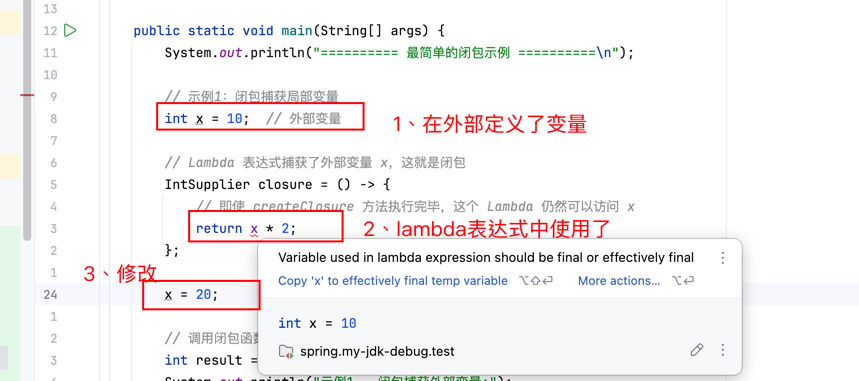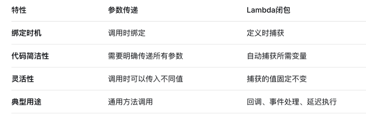 注意这里变量必须是 final/effectively final:确保闭包捕获的是"快照"而不是"引用"。