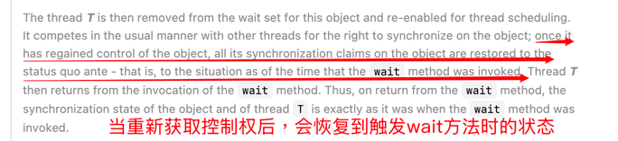 原因是 wait 方法在返回前就会去尝试获取锁,获取成功后在返回,而不是在 wait 方法外部去获取锁。这个就是差别。